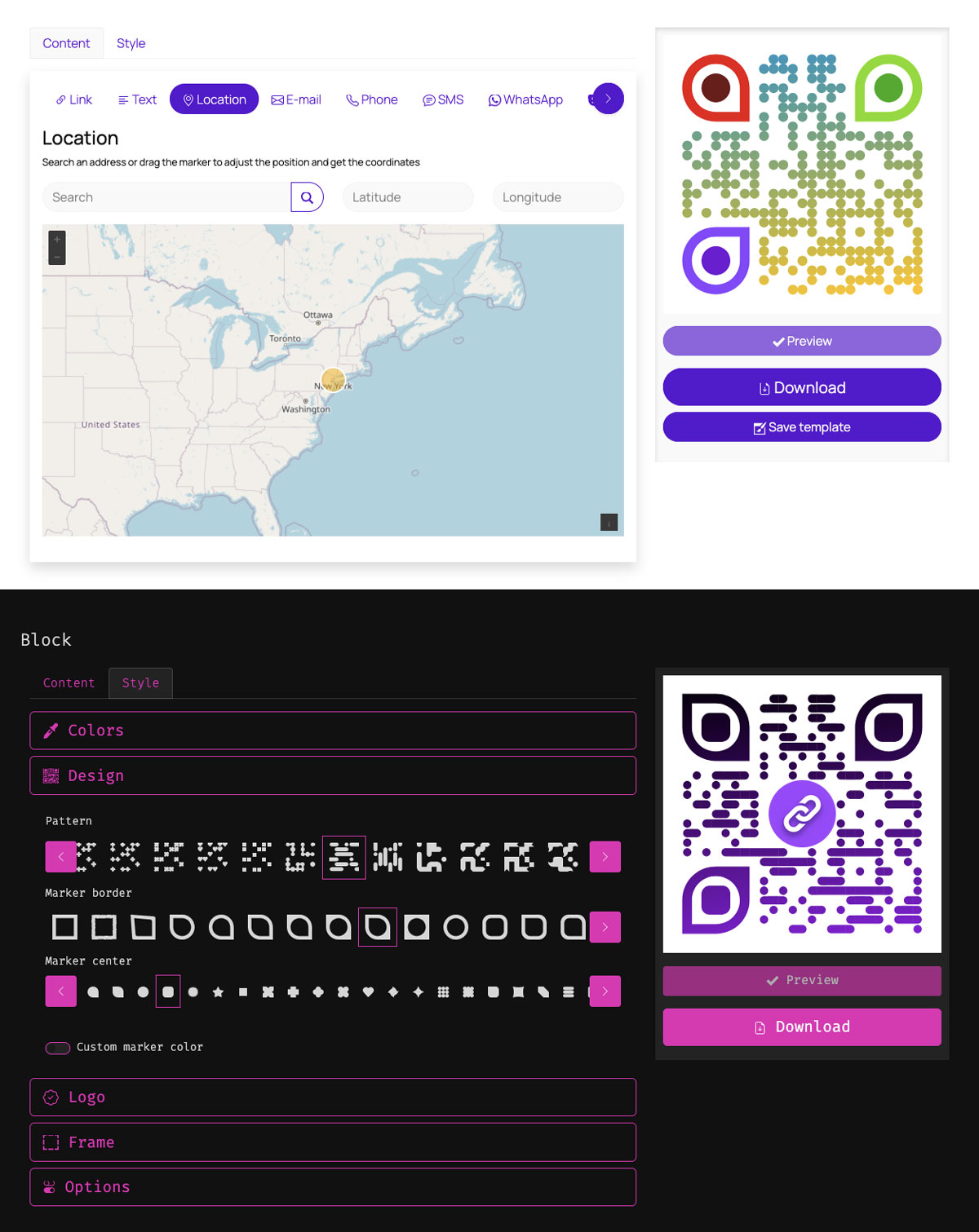 - Full visual customization: colors, gradients, logos, frames, and patterns.