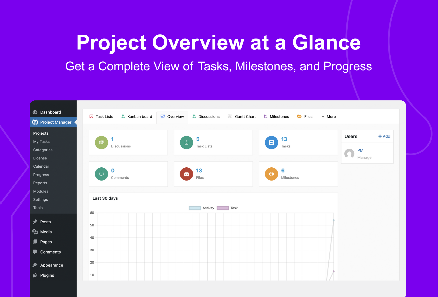 – WP Project Manager lets you manage projects without going to the backend interface.